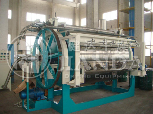 滚筒干燥机是—种内加热传导型转动连续干燥设备。旋转的滚筒通过其下部料槽,粘附着一定厚度的料膜热量通过管道输送至滚筒内壁传